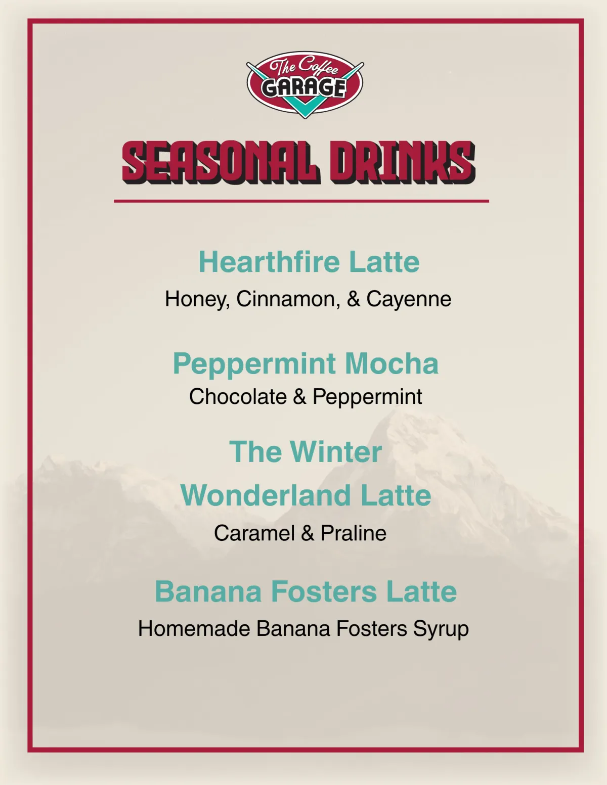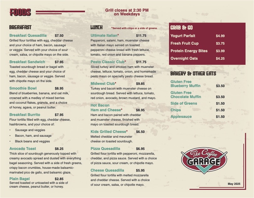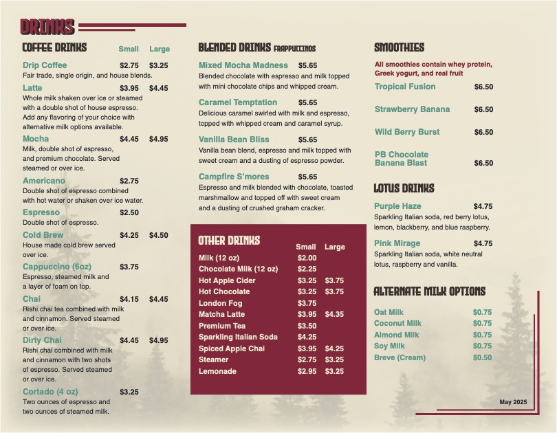 Offering a full menu for coffee drinks, treats, breakfast and lunch too! You can click the button below to view our full menu: