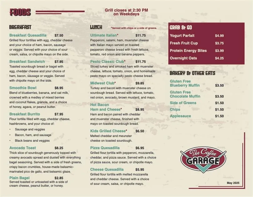 We plan to offer a full menu for coffee drinks, treats, breakfast and lunch too! Check back soon for more information or better yet, click the button below to get our updates sent to you: